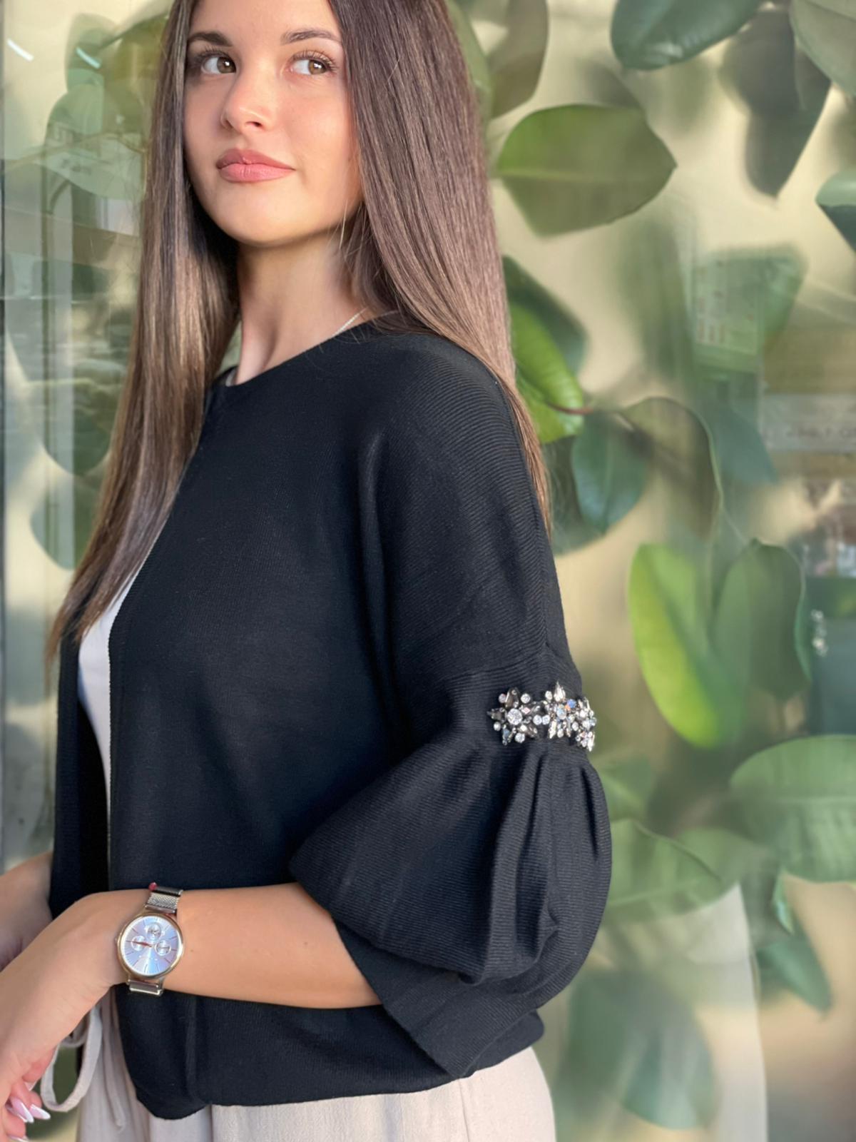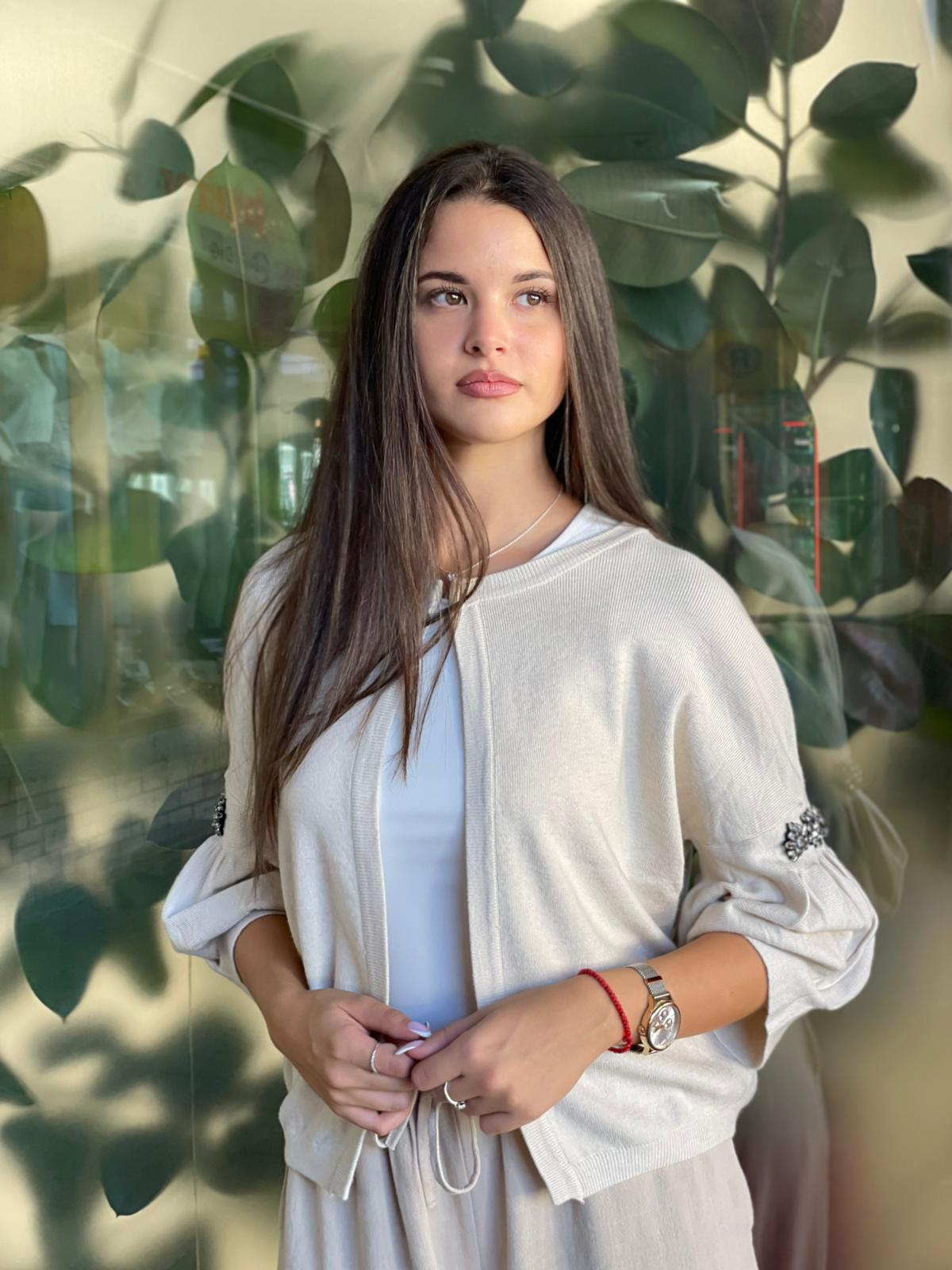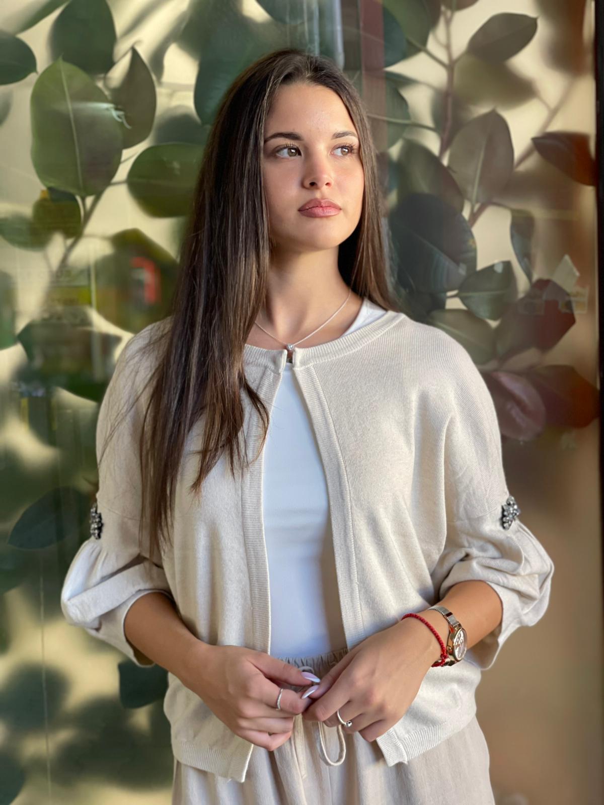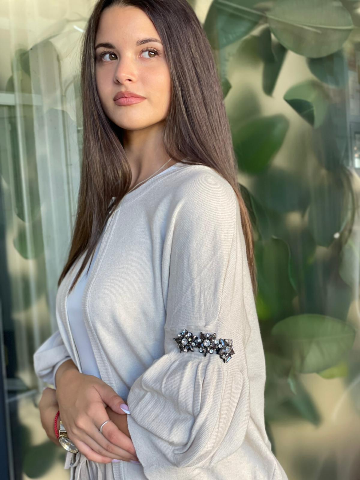 Ovaj džemper odiše luksuzom zahvaljujući posebno krojenim rukavima ukrašenim diskretnim, ali efektnim detaljima. Skriveno kopčanje dodatno naglašava sofisticiranost i daje uredan, profinjen izgled.