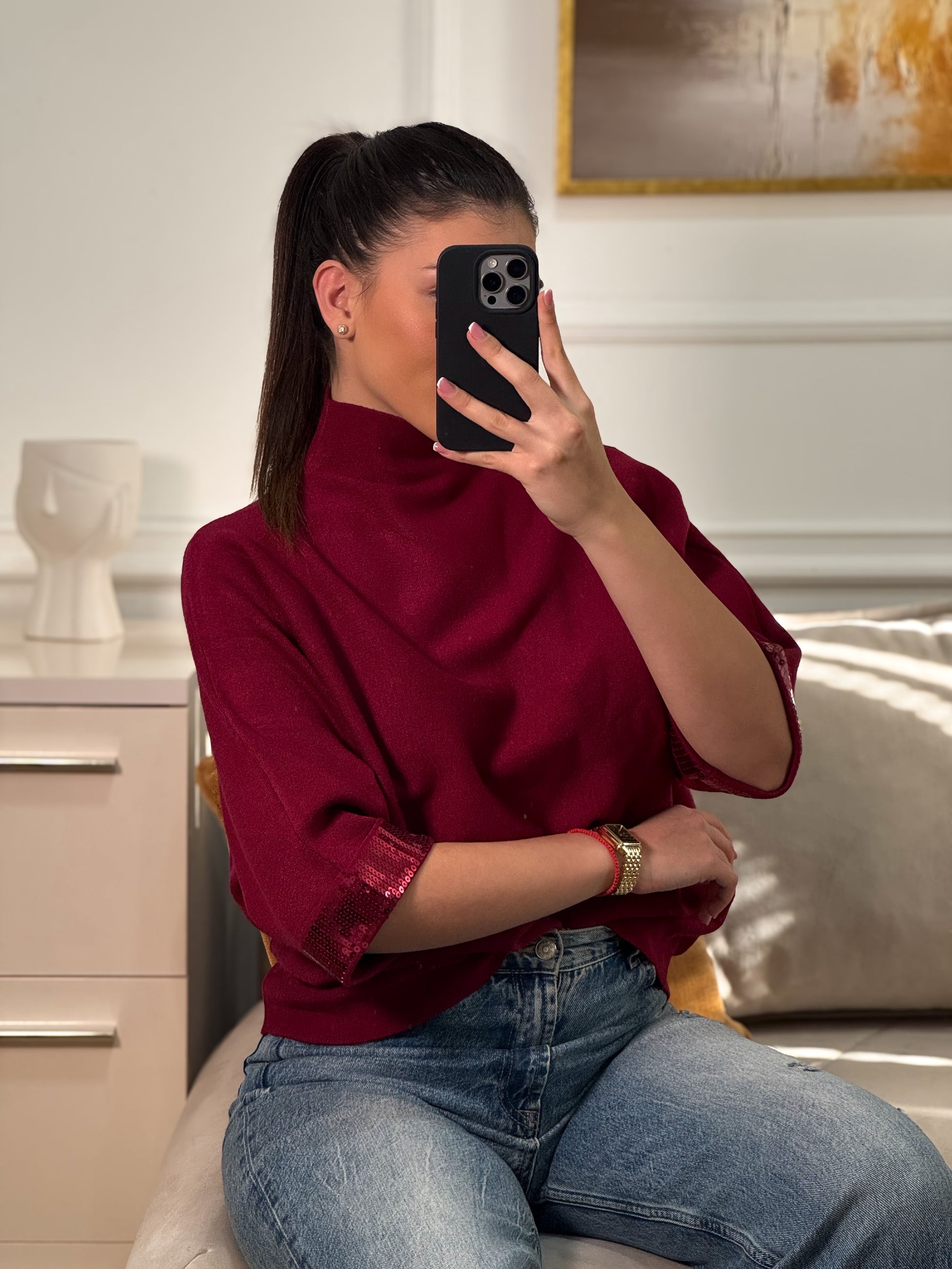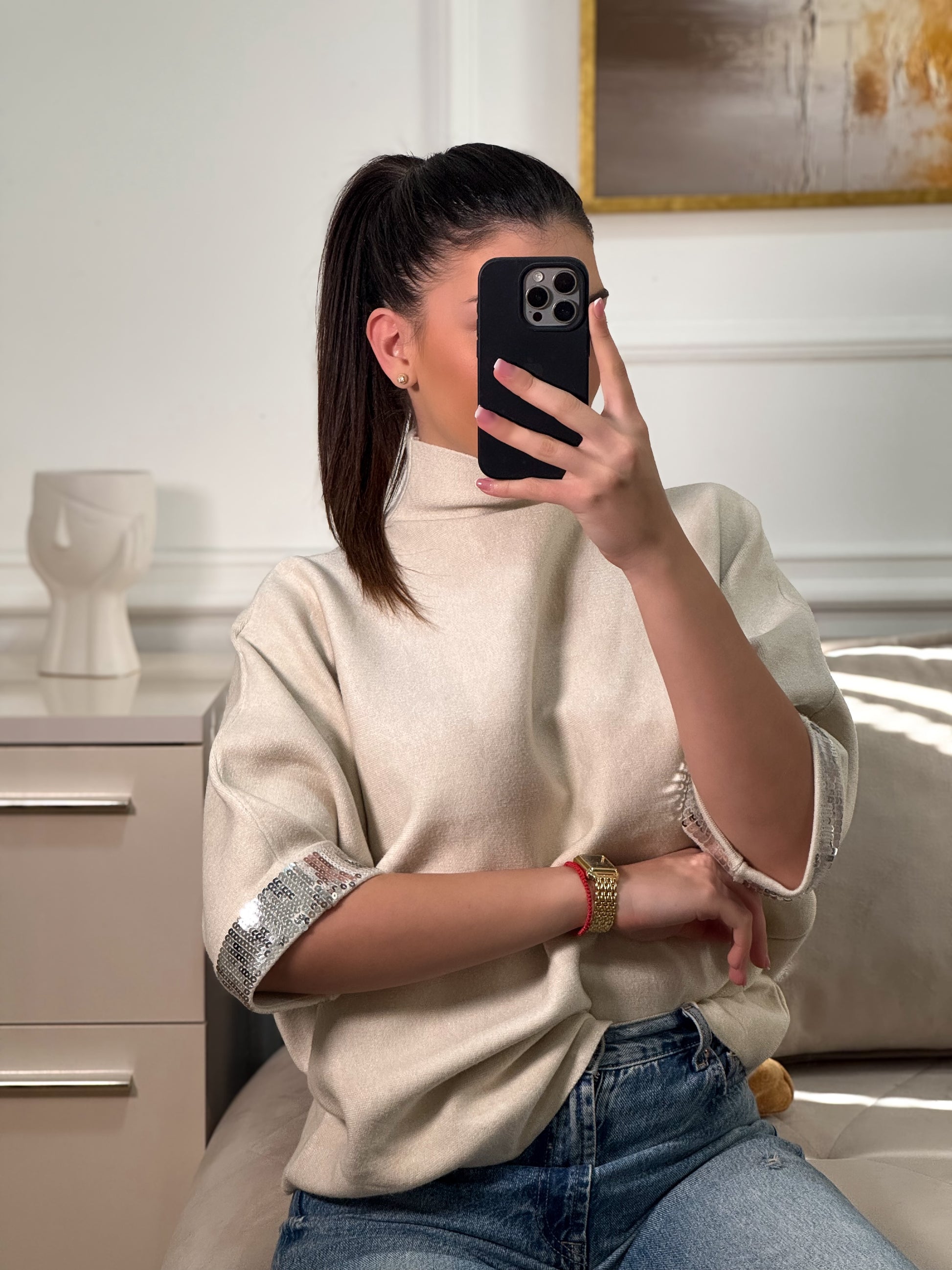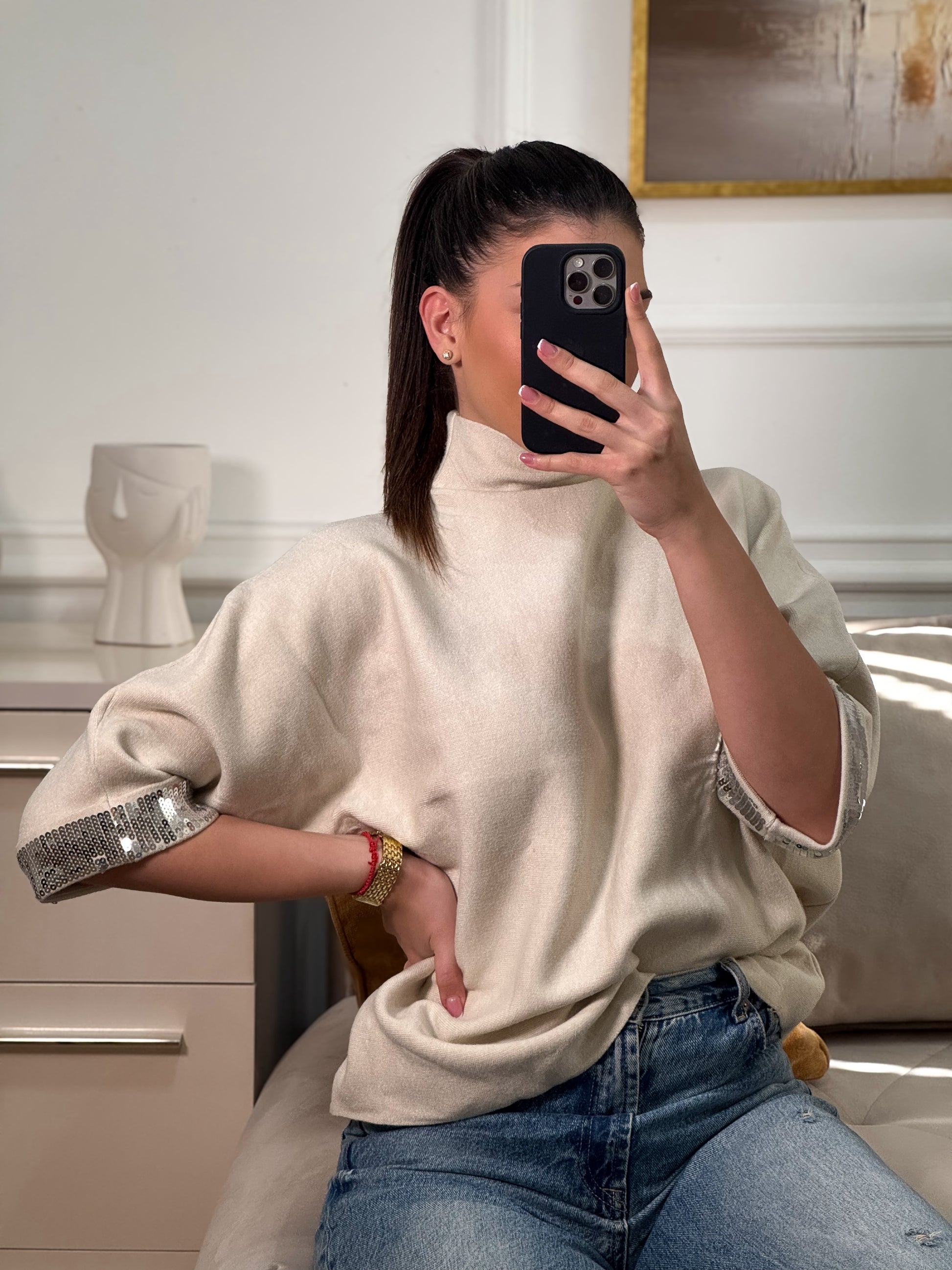 Naš kašmir džemper izrađen je od izuzetno mekane i prijatne tkanine koja nježno grli tijelo, dok široki rukavi ukrašeni elegantnim šljokicama daju posebnu dozu glamura i čine ovaj komad istinskim modnim favoritom.