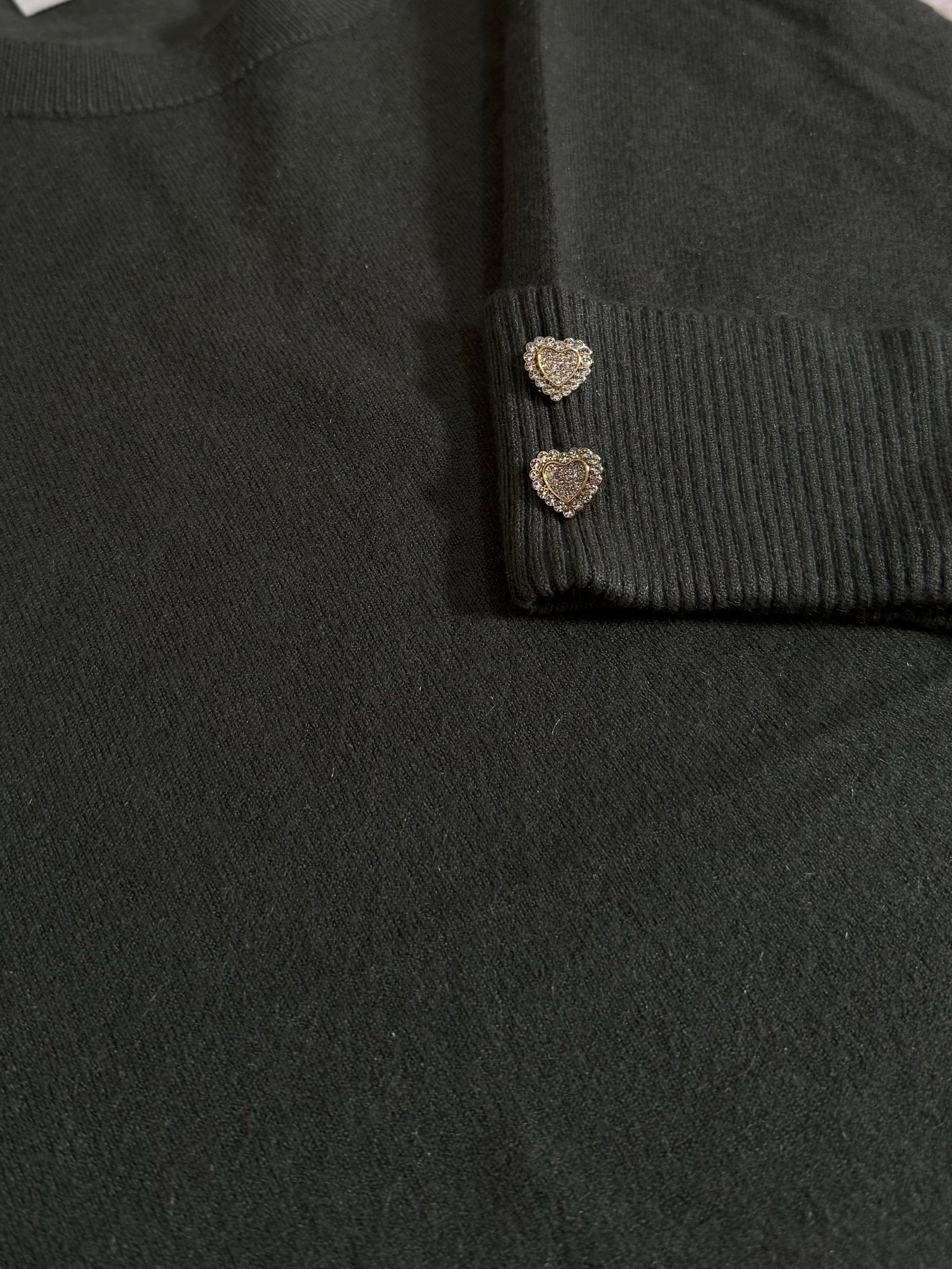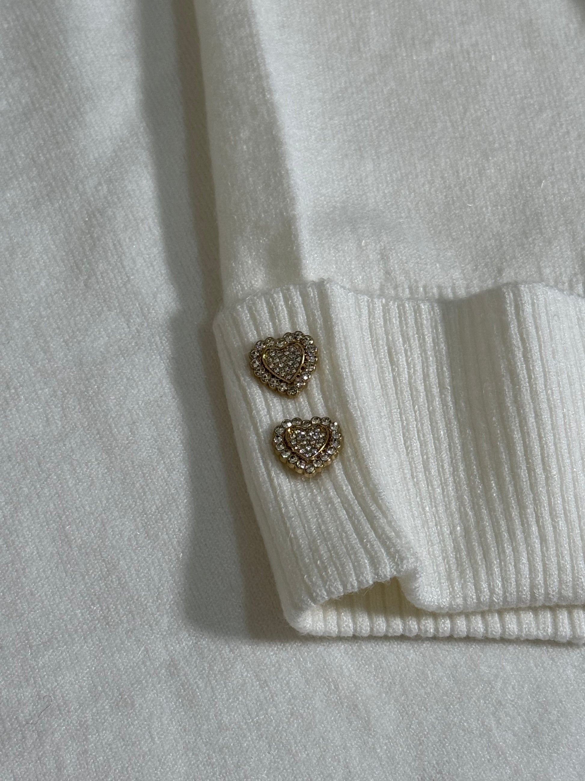 Mekan i ženstven – džemper od kašmira koji pruža udobnost i profinjen izgled u svakoj prilici. Posebnu draž daju mu ukrasni dugmići u obliku srca sa cirkonima na rukavima, detalj koji unosi dozu romantike i sofisticiranosti.