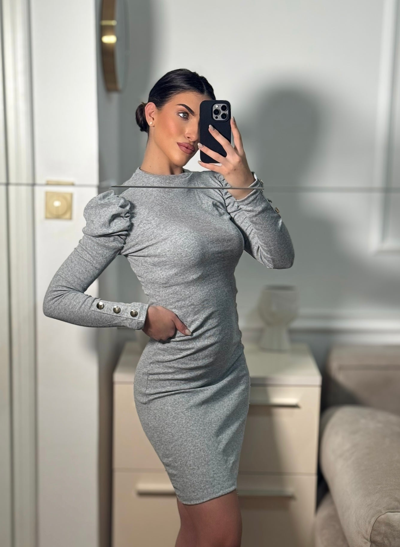 Elegantna, udobna i savršeno ženstvena – ova haljina od mekanog rebrastog pamuka ističe figuru na najljepši način. Model dolazi sa modernim puf rukavima i ukrasnim metalnim dugmićima koji joj daju poseban, chic izgled.